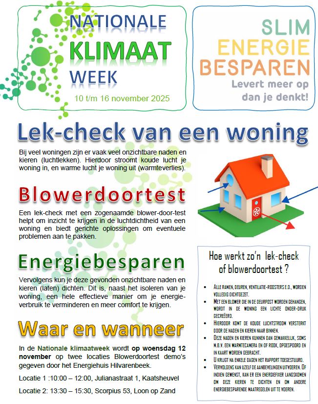 Op woensdag 12 november wordt ter gelegenheid van de Klimaatweek zowel in Kaatsheuvel als in Loon op Zand een lekcheck uitgevoerd. De moeite waard om te bekijken, want zo zie je waar in een woning de warmte weglekt. Zie onderstaand waar en wanneer.